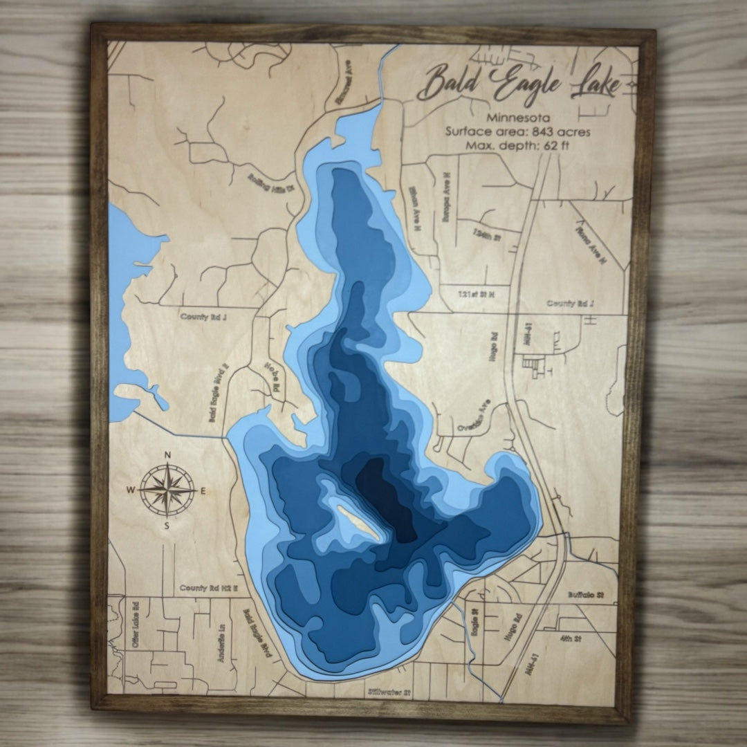 Crafted from premium quality wood, our laser-cut maps display intricate details that capture the unique topography of each lake bed. From gentle slopes to hidden depths, every contour is delicately etched, providing a visually stunning representation of the underwater terrain.