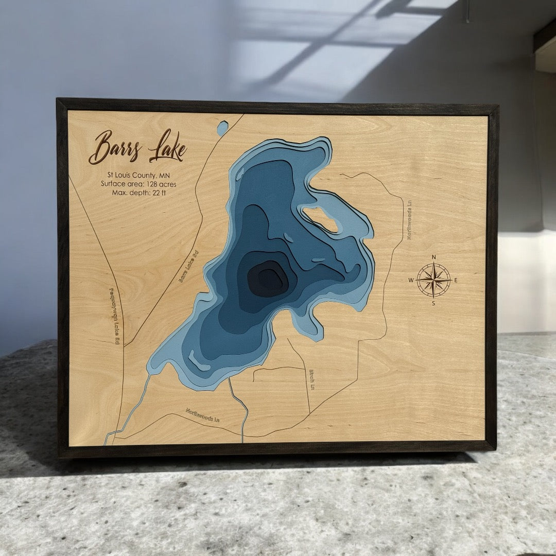 Barrs Lake is a popular destination for locals and tourists alike. Add a unique touch of decor to your home or lake cabin with a custom laser carved wood map. We craft the details that faithfully recreate the features that make up this lake.