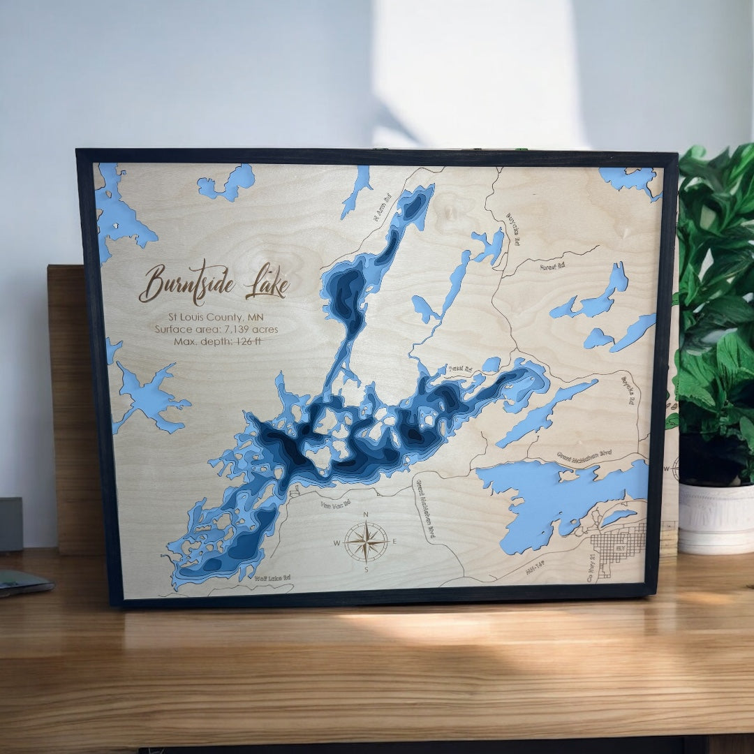 Bring the beauty of Burntside Lake home with you when your order one of our custom 3D wood lake maps. They offer a captivating addition to any space, enhanced by the grain of the wood and our expert craftsmanship. Shop now and learn how we can personalize your piece!