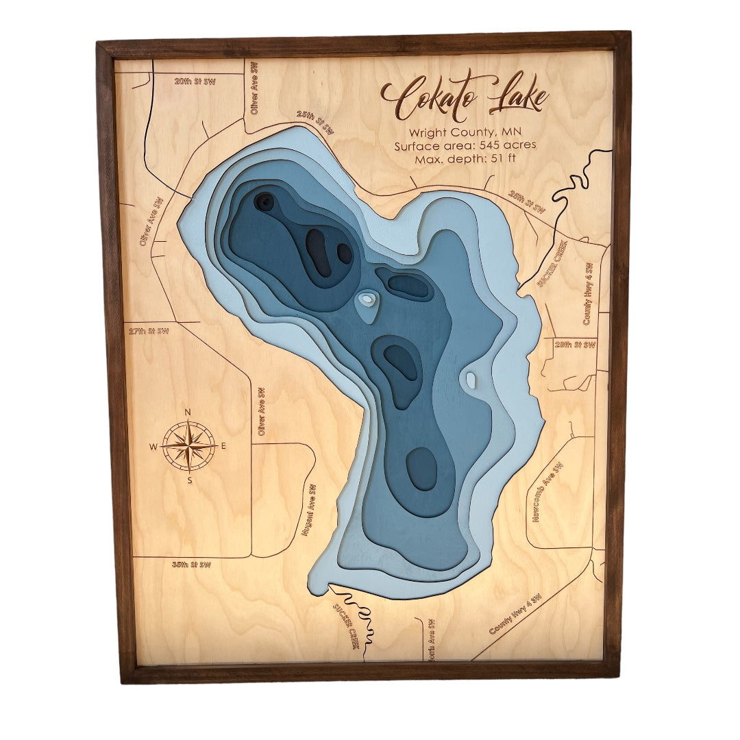 Add a touch of rustic charm with our custom wood artwork of Cokato Lake. This unique piece can be personalized to mark your cabin, favorite fishing spot, and more. Order today to bring your favorite lake memories home!