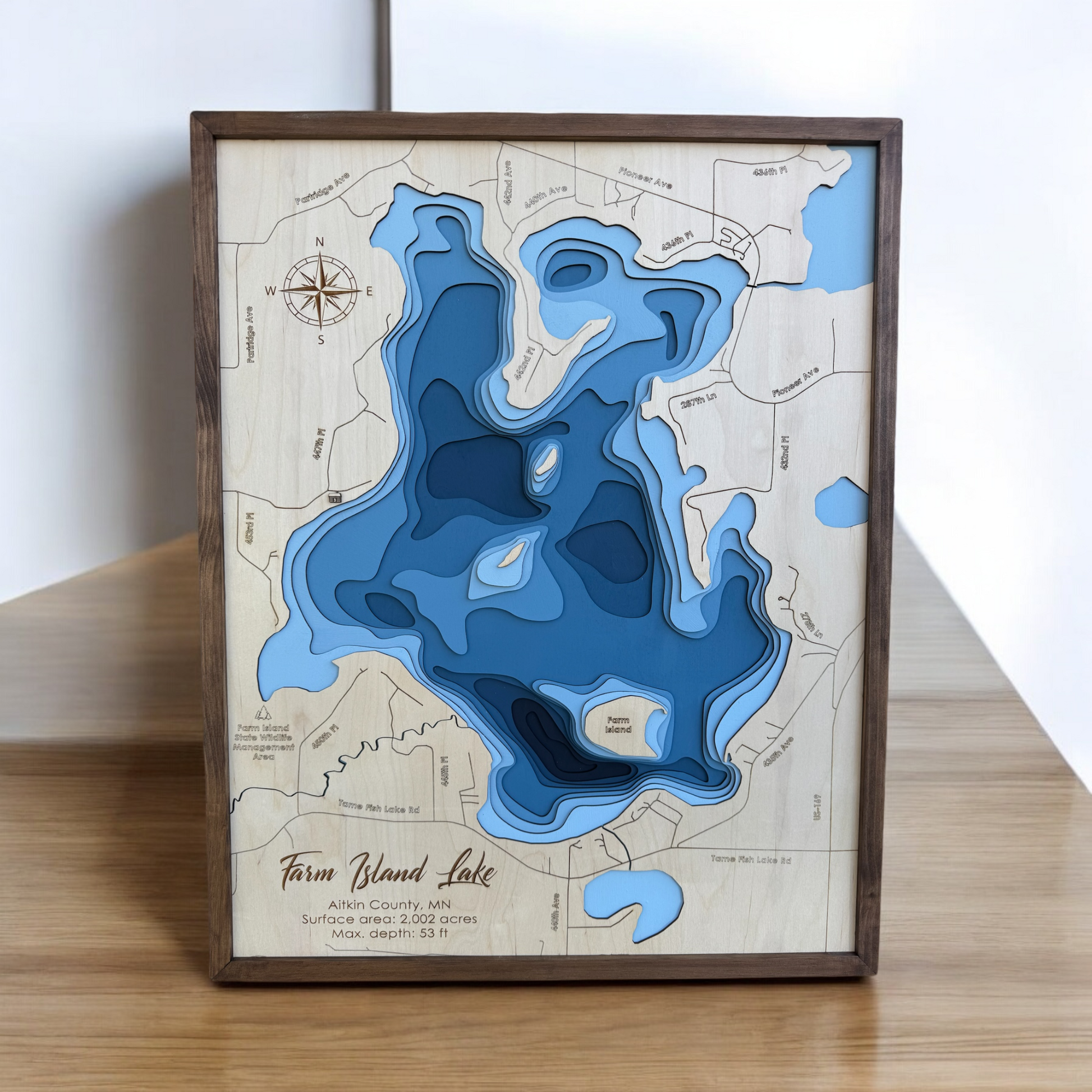 Bring the beauty of Farm Island Lake into your home or cabin today when your order a custom 3D wood map from our online store. We proudly craft each map with incredible attention to detail so that you don't miss a single thing about your favorite lake!