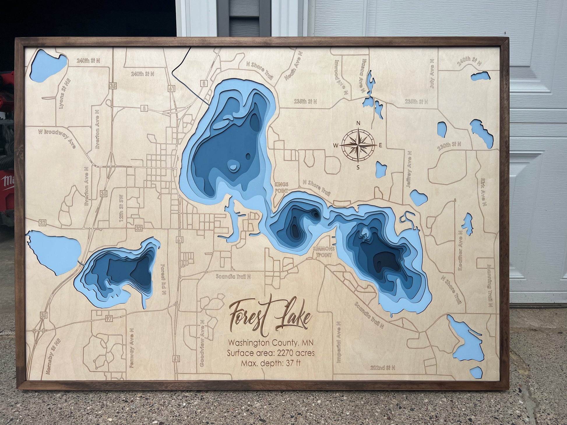 Each wood map we create is a unique homage to your favorite body of water. Whether it's a cherished childhood fishing spot, a serene getaway, or the backdrop to unforgettable memories, this personalized masterpiece brings the essence of the lake into your home. Shop today to order your personalized wood replica of Forest Lake.