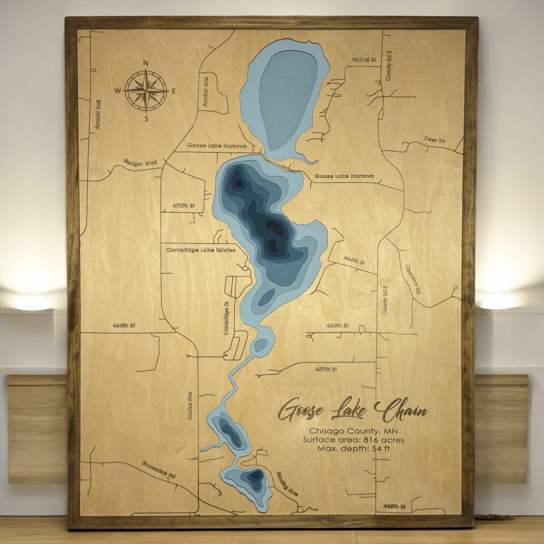 Bring the beauty of Goose Lake Chain home with you when your order one of our custom 3D wood lake maps. They offer a captivating addition to any space, enhanced by the grain of the wood and our expert craftsmanship. Shop now and learn how we can personalize your piece!
