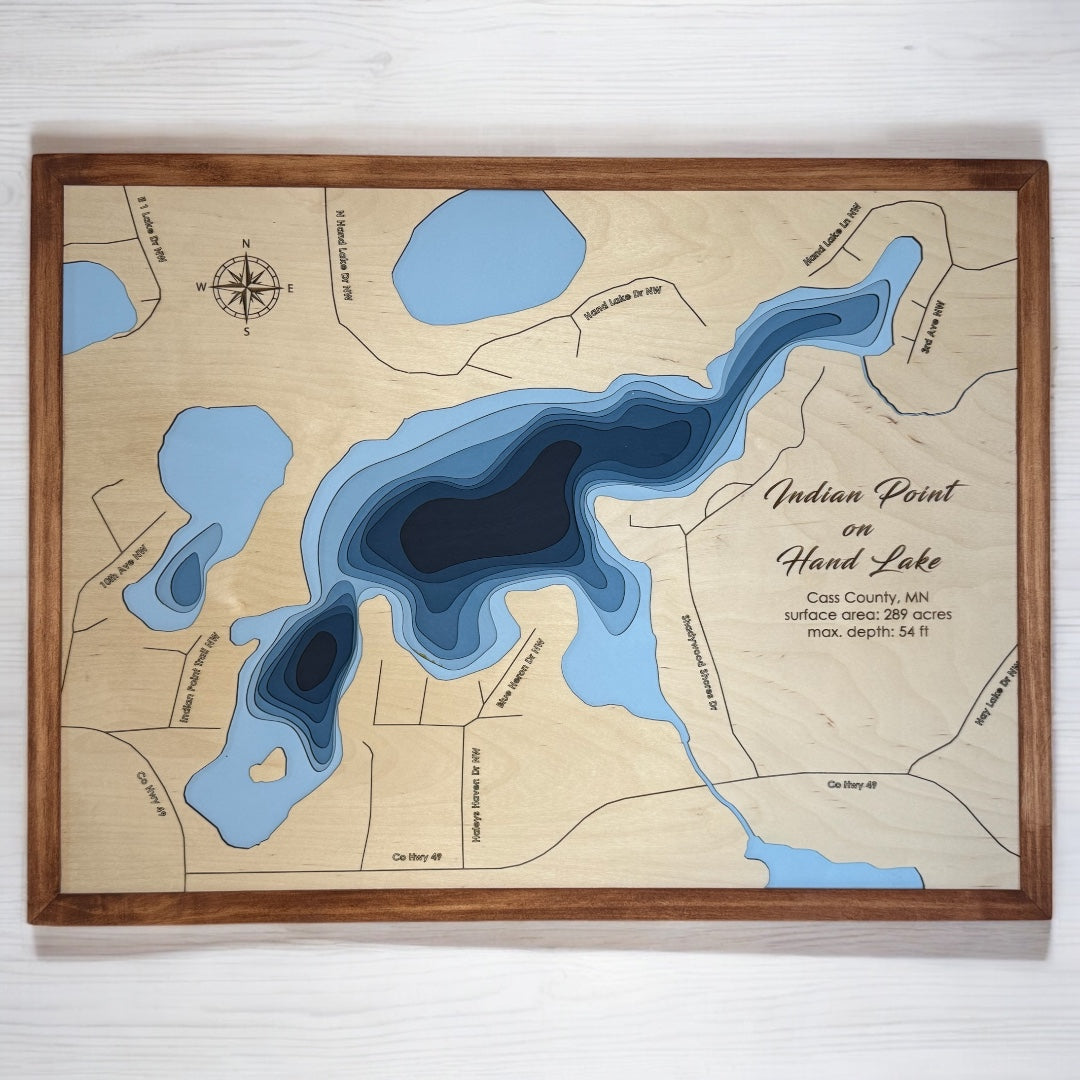 Hand Lake is a popular destination for locals and tourists alike. Add a unique touch of decor to your home or lake cabin with a custom laser carved wood map. We craft the details that faithfully recreate the features that make up this lake.