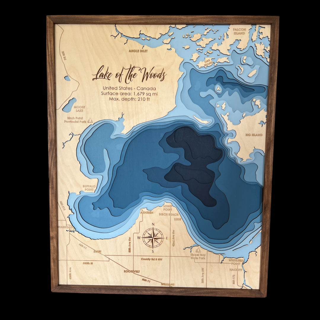We customize each of our maps to ensure that your desired details and personalizations are expertly produced. Walk down your memory lane at Lake of the Woods with our faithful 3D recreation of this gorgeous body of water.