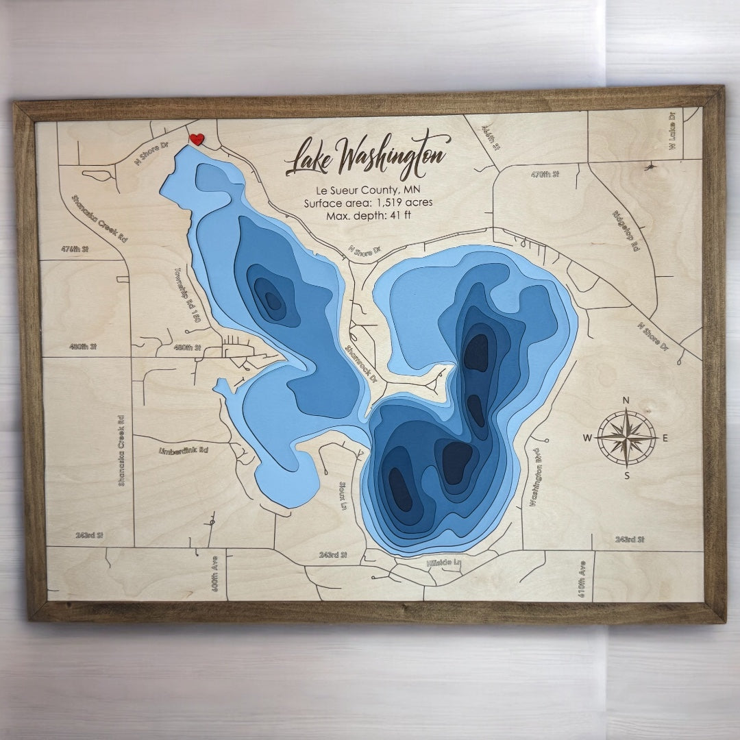 Lake Washington is a popular destination for locals and tourists alike. Add a unique touch of decor to your home or lake cabin with a custom laser carved wood map. We craft the details that faithfully recreate the features that make up this lake.