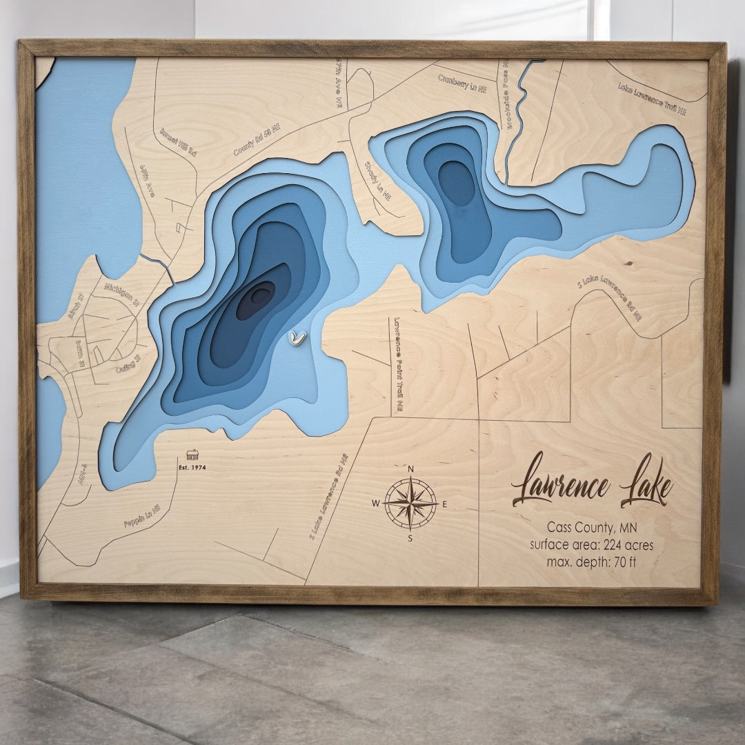 Bring the beauty of the Lawrence Lake home with you when your order one of our custom 3D wood lake maps. They offer a captivating addition to any space, enhanced by the grain of the wood and our expert craftsmanship. Shop now and learn how we can personalize your piece!