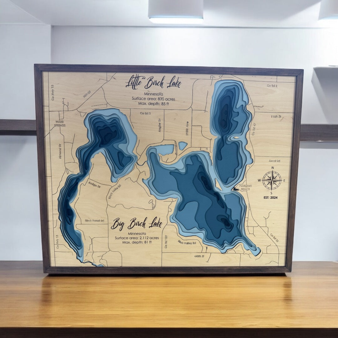 From fishing and water sports to time spent with friends and family, we know you want to keep your memories from time at Little and Big Birch Lake fresh. What better way than to order our handcrafted 3D wood map with faithful recreations of every curve and detail that make these lakes your favorite! Shop now!