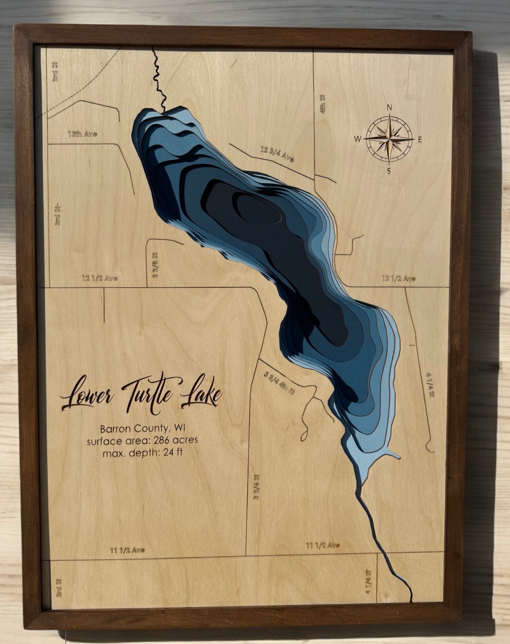 From water skiing and kayaking to paddleboarding, fishing, and more, there is a lot to love about Lower Turtle Lake. Bring home the beauty and memories of your time here with one of our handcrafted 3D wood maps. Shop our online store today!