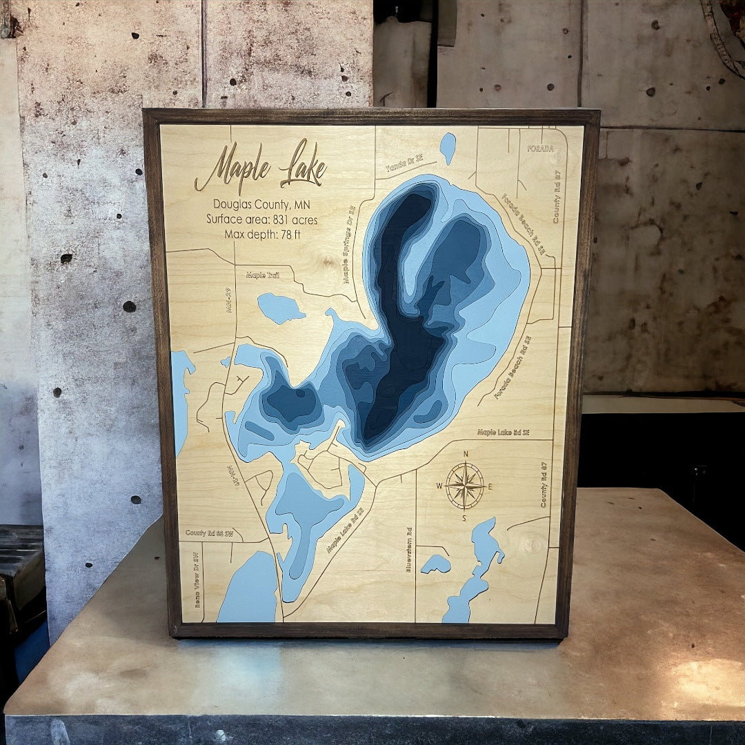 Just a short drive northwest of Minneapolis, Maple Lake offers a beautiful escape from city life. Order one of our custom made wood map replicas of this gorgeous body of water to display in your home or lake cabin. Shop now and learn how we can personalize your 3D art!