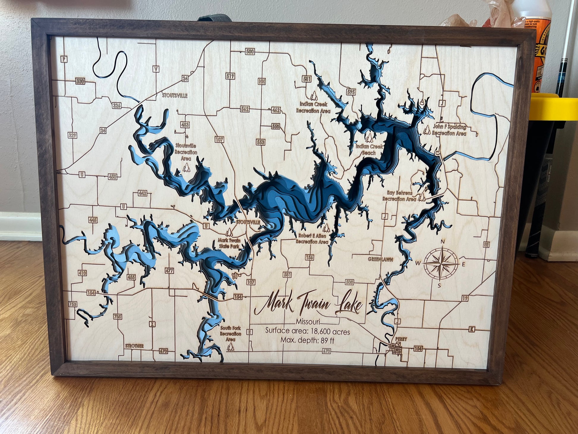 Mark Twain Lake is a beautiful reservoir in Missouri. Whether you enjoy boating, fishing, or other recreational activities, you're sure to love our faithful recreation of your favorite lake! Our custom wood map provides the intricate details and personalizations that make your map unique.