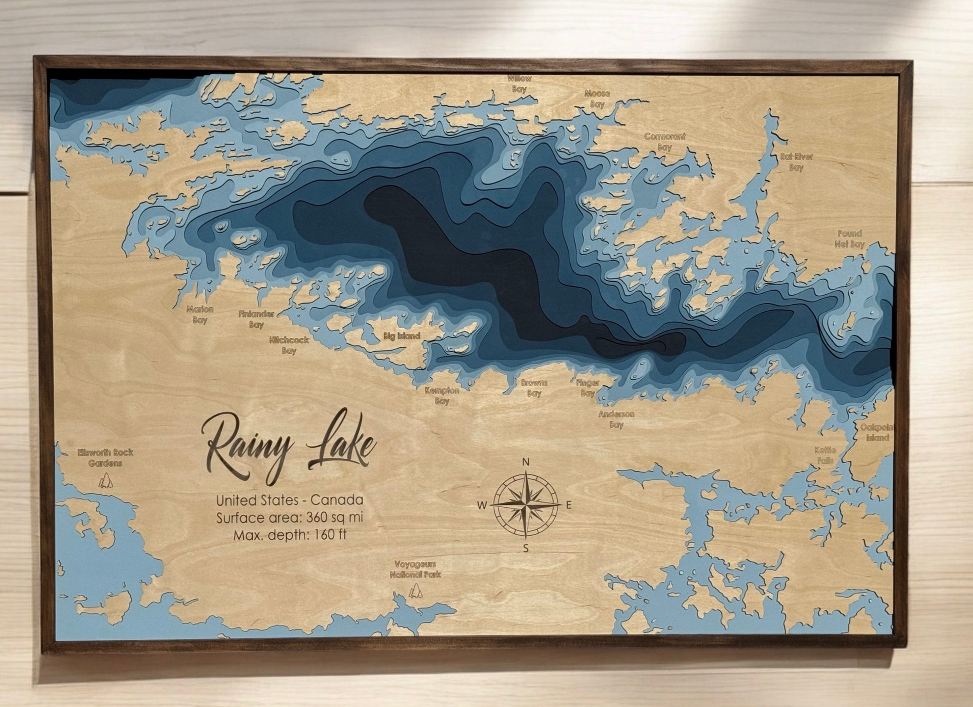 Rainy Lake is a fresh-water lake that straddles the U.S. and Canada borders. Known for world-class fishing, boating, kayaking, swimming, and more, we're sure you have many reasons that you love spending time at this gorgeous lake! Bring home the memories with our unique laser-carved wood map. We faithfully recreate each detail and provide the personalization options you want. Shop now!
