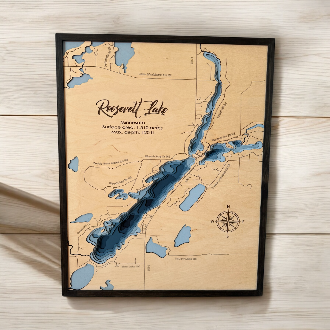 Roosevelt Lake is known for being a heavily wooded and quiet lake filled with birds and wildlife. No matter the reason that you love this lake, we know you'll be happy to order your copy of our handcrafted 3D wood map of Roosevelt Lake. We offer personalization options so you can make this map truly your own. Shop now!