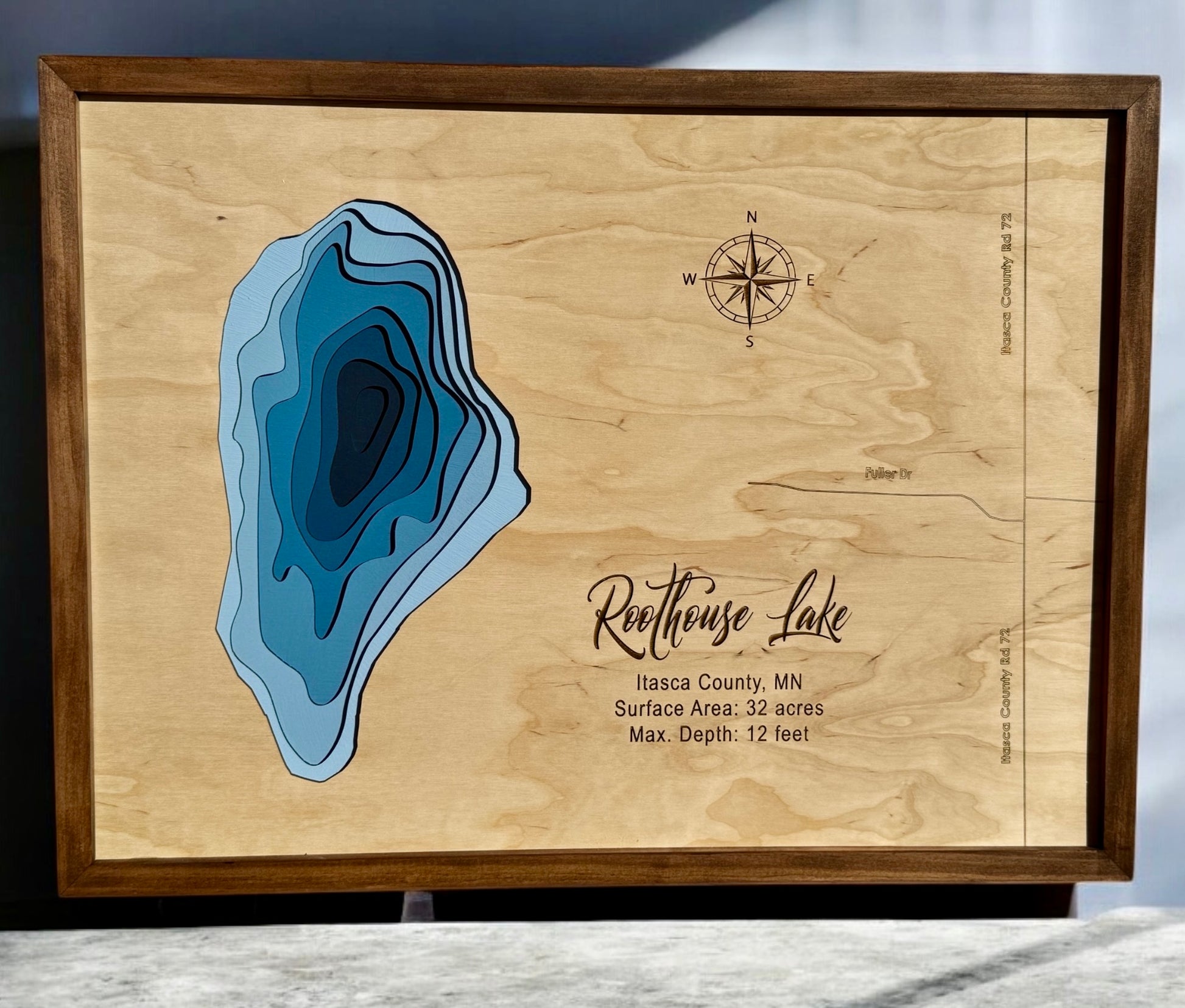 From gentle slopes to hidden depths, every contour is delicately etched, providing a visually stunning representation of the underwater terrain. The natural beauty of wood, combined with expert craftsmanship, makes our 3D wood lake maps a captivating addition to any space. Shop now, and learn about our personalization options!