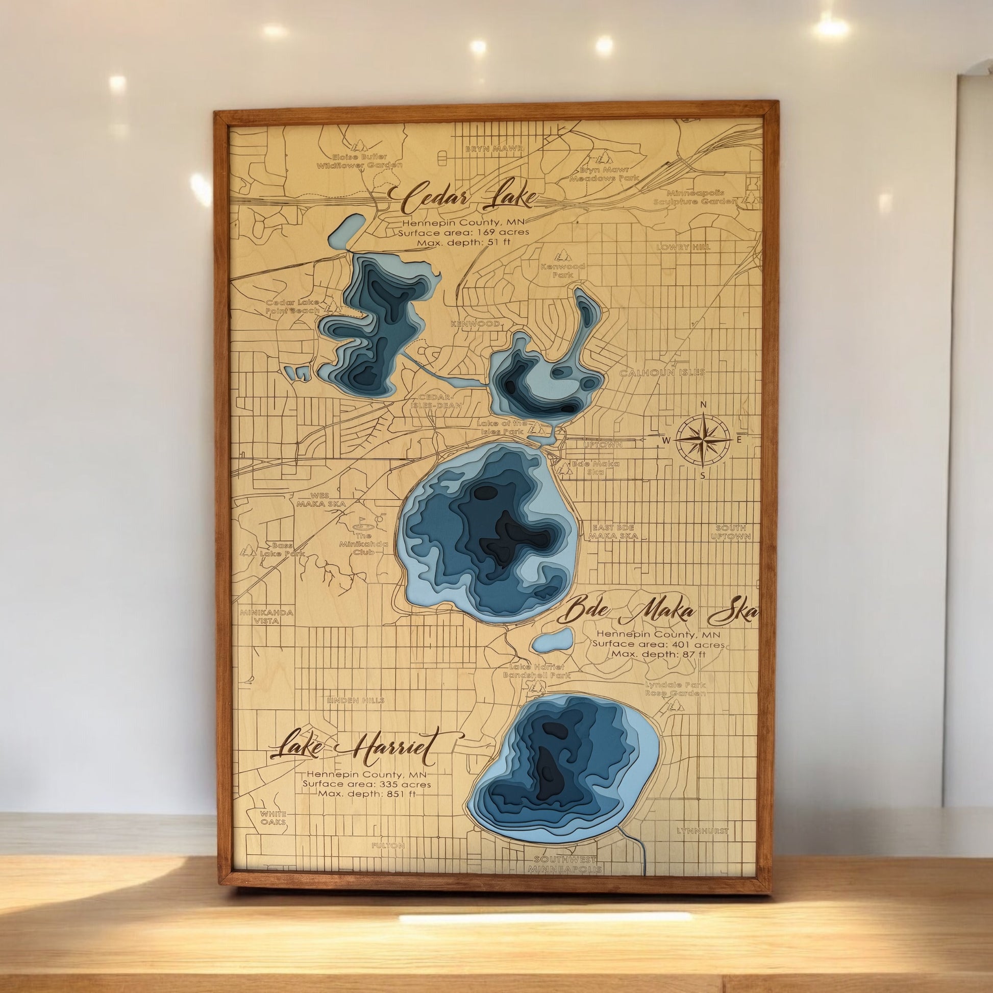 Previously named Lake Calhoun, Bde Maka Ska is the largest lake in Minneapolis and part of the Chain of Lakes. Bring home your love of lake life with one of our custom made 3D wood maps. Personalized and crafted to meet your specifications, we know you'll love it!